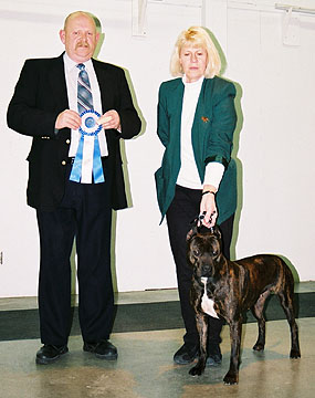 wins Junior Female Class at the Cascade APBT Club show Nov. 23, 2001 under Judge: Billie Huggins Handled by: Adrian Tackett Rooter is a daughter of Rooster. |