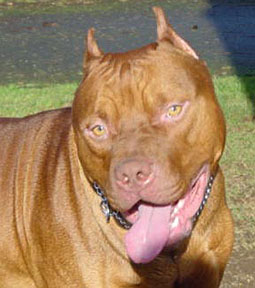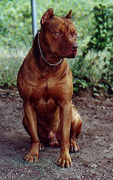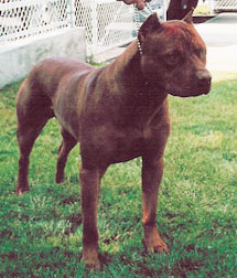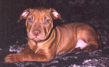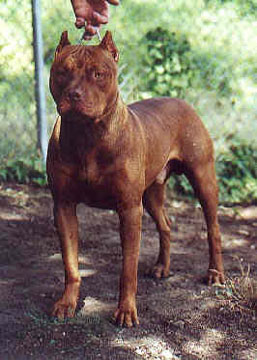 ![]() | "Red Ruckus is bred down from Old Family red nose lines. He was bred by Amber-lite Columbia River Kennel. His mother was bred by Red Ranger Kennels, and is now owned by Arizona Red Rock Kennels. Ruckus is a dog with his own mind, he is highly independent, and intelligent. He loves attacking sprinklers and water hoses. Ruckus has showed promise at weight pulling, and is an amazing athlete. When other dogs are gasping for air Ruckus is hardly panting. His disposition couldn't be better and he has passed his first obedience class. He is truely cut from a mold of the past Hemphill dogs." -Tim |